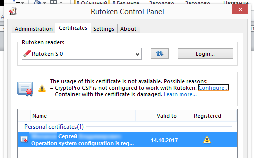Никак не могу победить проблему "Крипто ПРО CSP не настроен для работы с Рутокен"