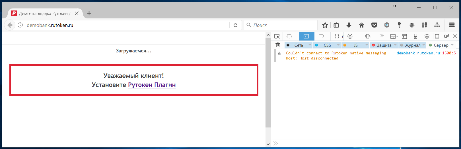 Couldn't connect to Rutoken native messaging host: Host disconnected demobank.rutoken.ru:1508:5В Firefox для Windows плагин заработал. Предупреждение об установке Rutoken Plugin Adapter возникло после перезапуска браузера. После установки адаптера плагин на демостранице заработал.