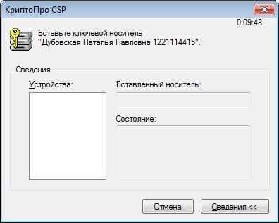 На этапе выбора ключевого носителя (в окне КриптоПро "Устройства") при выборе носителя контейнера ПУСТО. Нет ни одного доступного носителя.  Видит только Дискету (если подключена).