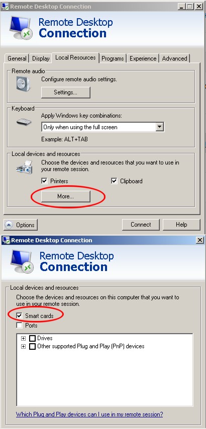 Проброс смарткарты с терминала на сервер происходит автоматически когда вы в настройках подключения ставите галку "использовать смарткарту"