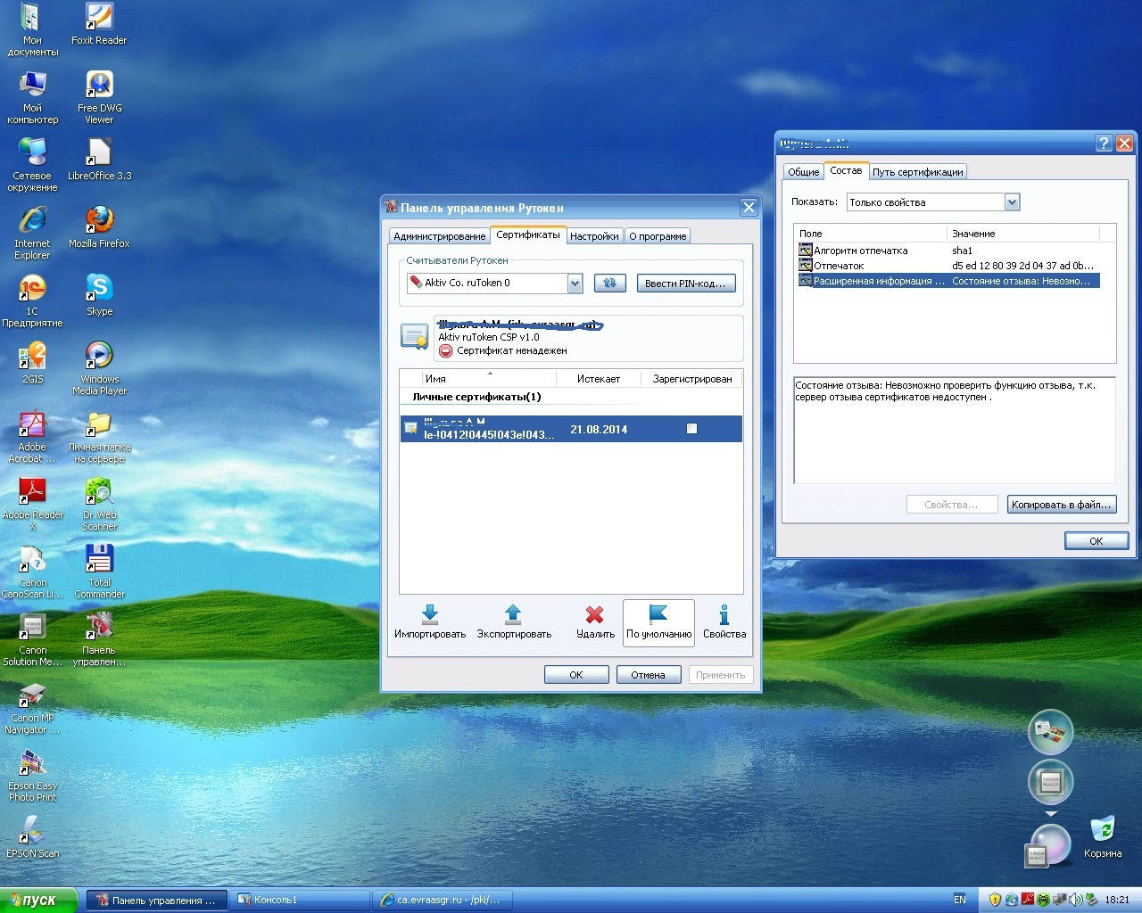 Корневой  и выпускающий Центры Сертификации под Windows server 2012 st. Edition. Корневой CA –автономный, на виртуальной машине. Выпускающий  (ISS-CA), он же центр сертификации предприятия, развернут на отдельном физическом сервере, включенном в домен. На рабочей станции под Windows 8 запрошены сертификаты для пользователей (через Enroll On Behalf Of) по шаблону «Вход по смарт-карте» и записаны на Рутокен (тип S 32K).  Панель управления Рутокен (версия 2.87.00.0476) на станции выдачи показывает, что сертификат действителен. Аутентификация  в домене по смарт-карте благополучно проходит на компьютерах как под Windows 8, так и под Windows Vista (машины под Windows 7, зарегистрированной в домене, под рукой нет, но уверен, что с ними проблем не будет). Зато под Windows XP «Вход по смарт-карте» не работает. Заходим по паролю, запускаем Панель управления Рутокен (версия 2.87.00.0481) и видим, что сертификат есть, но он отмечен ка ненадежный, если посмотреть состав сертификата, то в последней строке свойств видим «Расширенная информация», в которой «Состояние отзыва: Невозможно проверить функцию отзыва, т.к. сервер отзыва сертификата недоступен». Запускаем оснастку «Сертификаты» и открываем «Доверенные корневые центры сертификации», находим здесь сертификат нашего корневого CA, открываем его и видим тоже самое –он помечен как ненадежный и на вкладке «Путь сертификации» читаем: Этот сертификат содержит недействительную цифровую подпись». Запускаем на контроллере домена (отдельный сервер под Windows server 2012 st. edition) PKIView и видим, что все хорошо для обоих CA – и состояние сертификатов и расположение AIA , CDP (размещены только на сайте). Вопрос – почему цифровую подпись  корневого CA  Windows XP считает недействительной, а более свежие ОС "читают" ее без проблем?