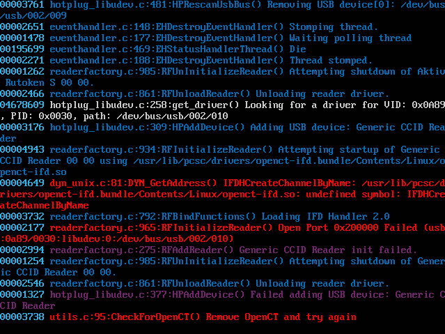 00000017 utils.c:95:CheckForOpenCT() File /var/run/openct/status found. Remove OpenCT and try again