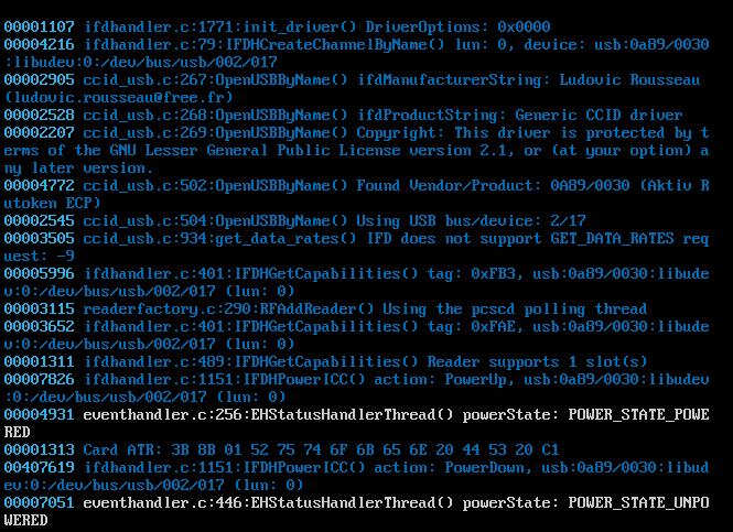00000021 readerfactory.c:934:RFInitializeReader() Attempting startup of Aktiv Co. Rutoken S 00 00 using /usr/lib/pcsc/drivers/ifd-rutokens.bundle/Contents/Linux/librutokens.so