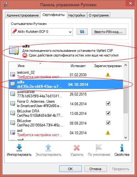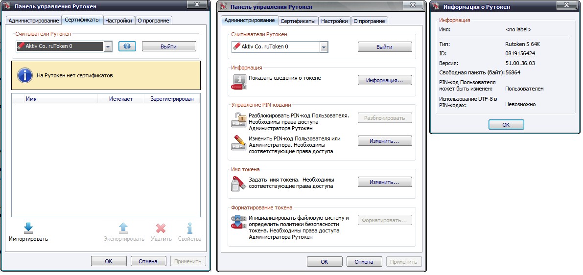 Вот такая проблема - на приложенном скриншоте; совмещены два изображения, для ясности. Я точно знаю, что на нем есть сертификаты, потому что на другом компьютере, с установленным VIPCSP они используются. Так как компьютер далеко, в администрации сельского поселения, я не могу посмотреть, видны ли там сертификаты на рутокене из Панели управления Рутокен.