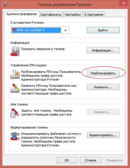Для его разблокирования нужно воспользоваться "Панелью управления Рутокен".