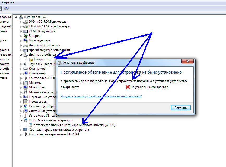 При подключении к компьютеру с Windows 7 (Home, Proff) системе не удается установить драйвер для смарт-карты, хотя для устройства чтения смарт-карт драйвер устанавливается. Интернет на компьютере в момент подключения токена есть.![]()