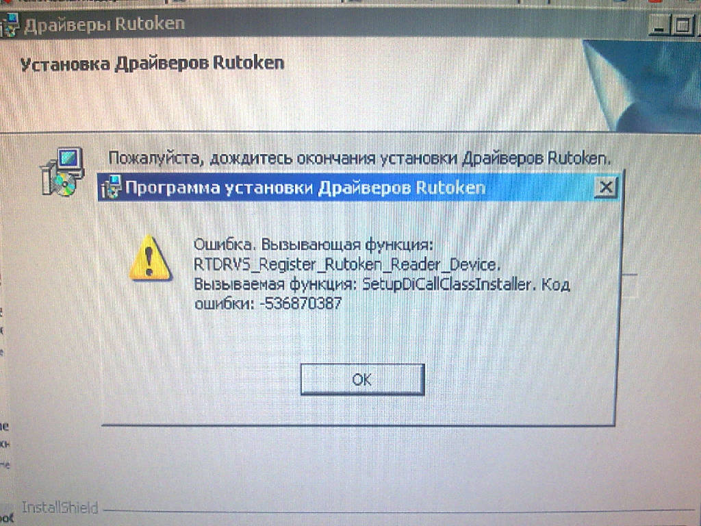 При подписании документа с  использованием ЭЦП погас РуТокен, ЭЦП не вставляется, при удалении и переустановке драйверов вылетает ошибка - см .фото и программа сворачиваетв все действия.