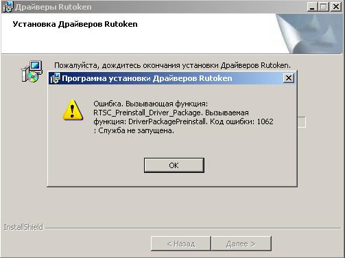 Ошибка. Вызывающая функция: RTSC_Preinstall_Driver_Package. Вызываемая функция: DriverPackagePreinstall. Код ошибки: 1062 : Служба не запущена.