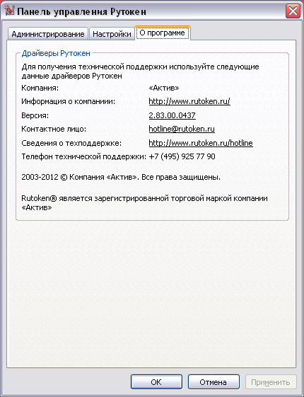 Версия панели управления рутокен: 2.83.00.0437