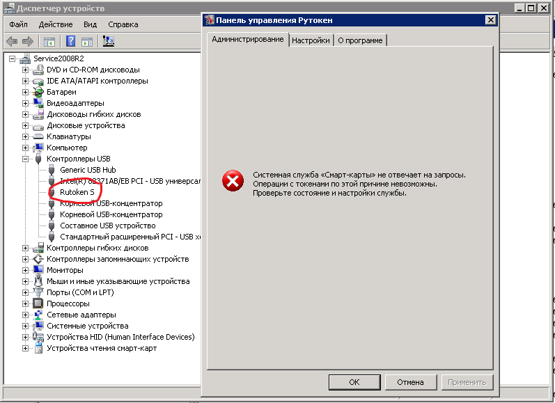 Здравствуйте, перешли на новую ОСь Windows 2008 R2, возникли проблемы с токеном. Выкачал с вашего сайта 64 битные драйвера версии 2.85, поставил, дрова встали нормально, но вот панель управления токенами отказывается работать, служба Смарт-карт не отвечает, перегружал службу, не помогло. Подскажите чего-нить.![]()