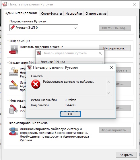 Добрый день. Не удается подписать запросы ключем. Неверный пин. При попытке в панели управления рутокена войти, ошибка - референсные данные не найдены. Пин стандартный и не менялся. Рутокен определяется. Сертификаты на нем видны. Возможно некорректно был извлечен. В чем м.б. проблема?