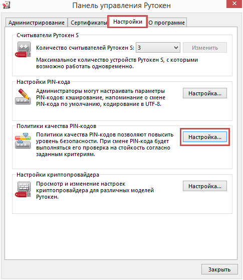 1) Изменение политики качества PIN-кода через "Панель управления Рутокен"