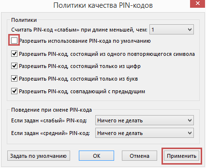 Снимите флаг с поля "Разрешить использование PIN-кода по умолчанию" и нажмите кнопку "Применить" или "ОК".![]()