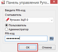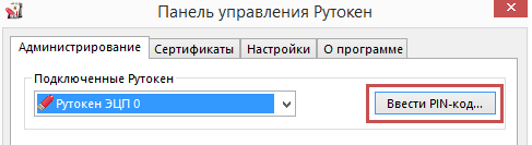 После выполненных действий в "Панели управления Рутокен" на вкладке "Администрирование" нажимаем кнопку "Ввести PIN-код". ![]()
